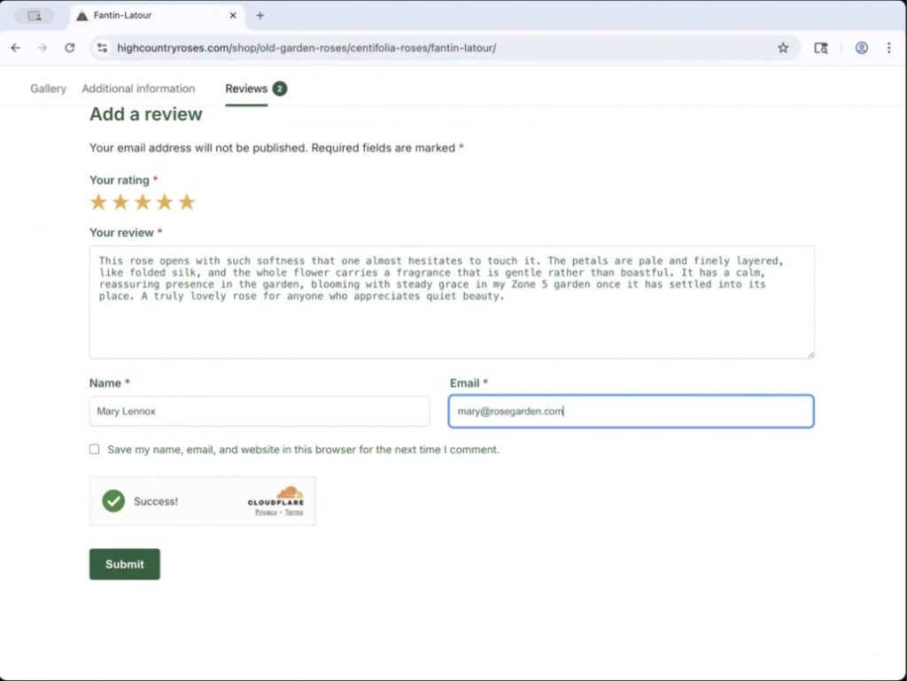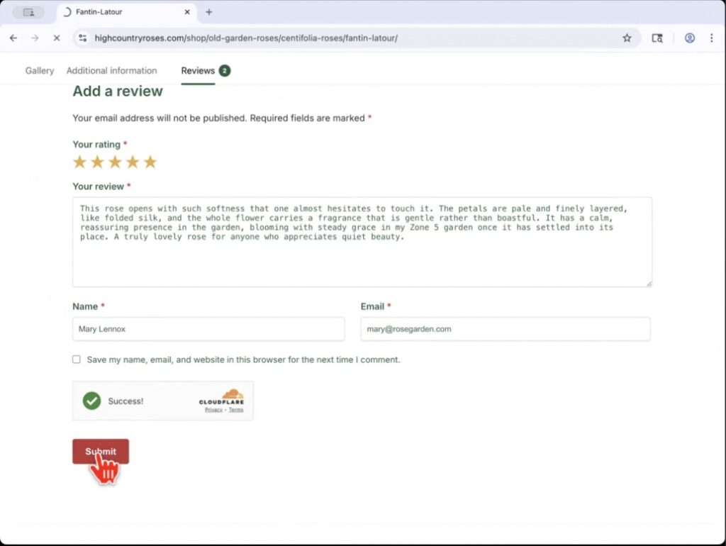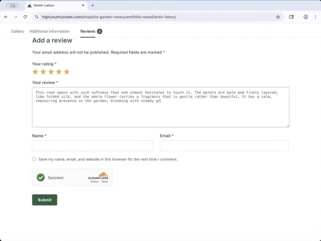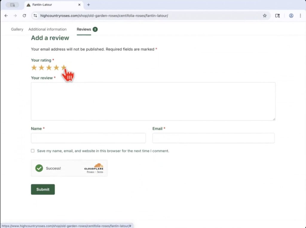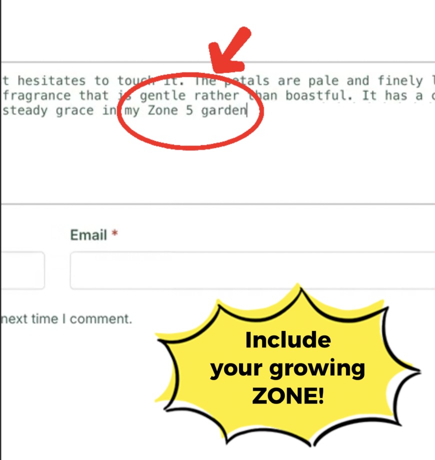 Once you click on the review tab, the screen will open that allows you to enter your review. You will need to give the rose a star rating from 1 to 5 stars depending on your experience and give a few words explaining your review. I really appreciate it when you include the zone you are growing in. I find it helps people understand the rose’s performance a little better.