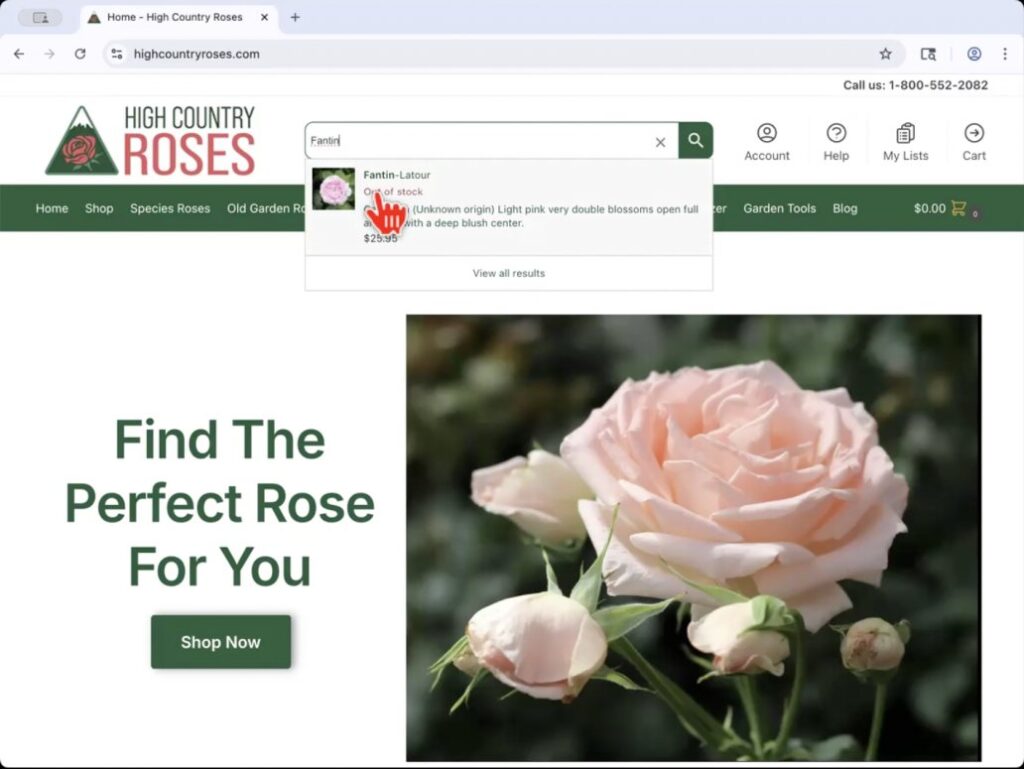 Here’s a quick tutorial explaining how to leave a variety review on our website. Start on the website’s homepage where the search bar is located directly at the top of the website. In this case, I am searching for my rose, Fantin-Latour . You can click on the quick drop down link (photo on the left), or press return to get the full search results (photo on the right). Click on the rose you are looking for in either method and you will be taken to the variety’s product page.