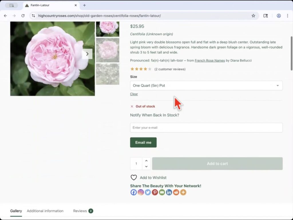 The rose product page is pictured below and contains all of the variety’s information, photos and allows to add the rose to your shopping cart by selecting the pot size.