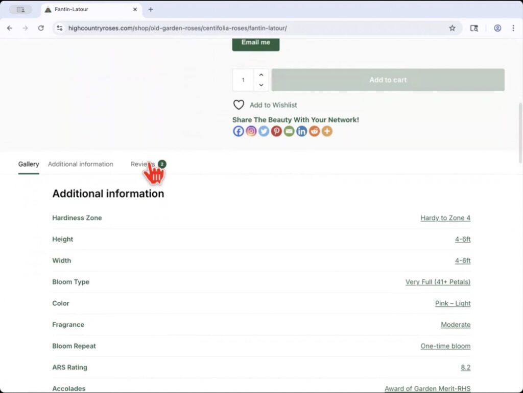 Scroll down on the variety’s product page to see more information about the rose and your will find the review tab.