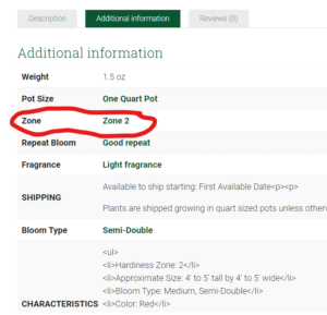 Once you know your conditions, you can search for roses by growing zone. We assign a zone designation to each variety we sell. Our designation is based on input from breeders, individual growers and historical information. We even have a few test gardens in exceptionally tough conditions to make sure your roses will perform. Look for zone information on each product page under the “Additional Information” tab.