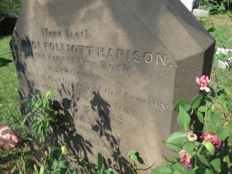 A few years ago my daughter and I toured the lovely courtyard garden at the Church of the Intercession in New York City where many lovely old roses grow. Behind the church is an cemetery steeped in history. Great rose friend, Stephan Scanneillo, President of the Heritage Rose Foundation, knew of my love for the Harisonʼs Yellow rose and guided us to this lovely cemetery for a special surprise. We passed by beautiful grave stones, many with names we were familiar with like John James Audubon, John Jacob Astor, James Monroe and others. Winding through lovely iron fences and gates, we came to a very special stone–that of Mr. George Folliott Harison. As I stood in front of his gravestone, I felt as though I was visiting a member of my family and we shared a bond. The gravestone said, “Mr. Harison was a gentlemen”. I love knowing that.