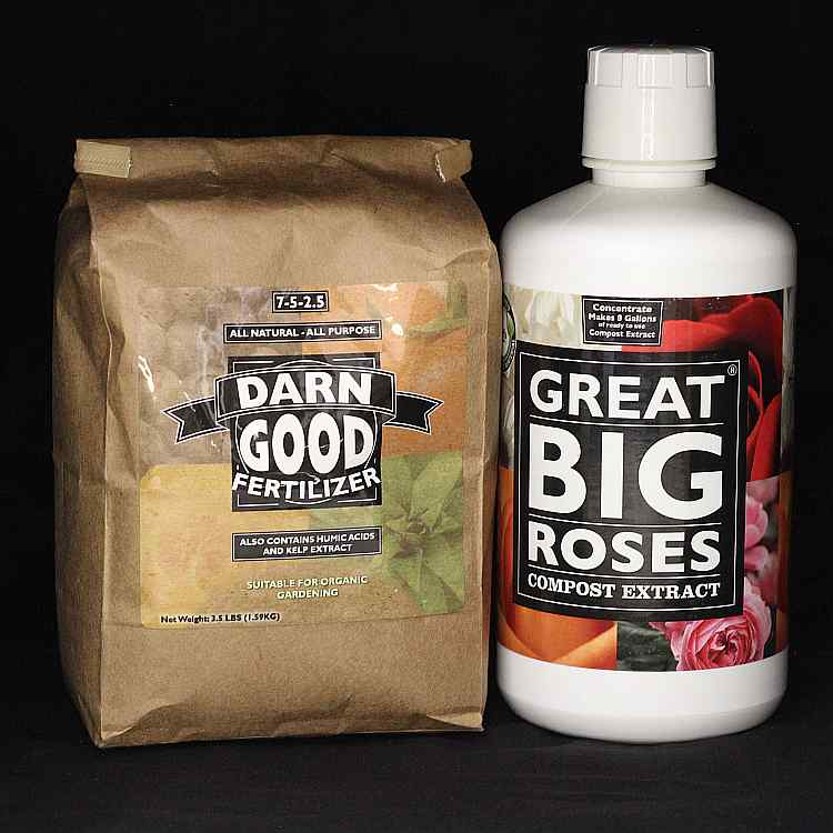 Darn Good Fertilizer is a natural, all-purpose fertilizer that is unique among organic fertilizers in that it contains both quick release and slow release sources of nitrogen (N).  Great Big Roses Natural Compost Extract is specially designed to improve the health and performance of both plant and soil.