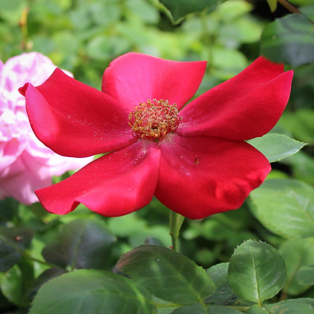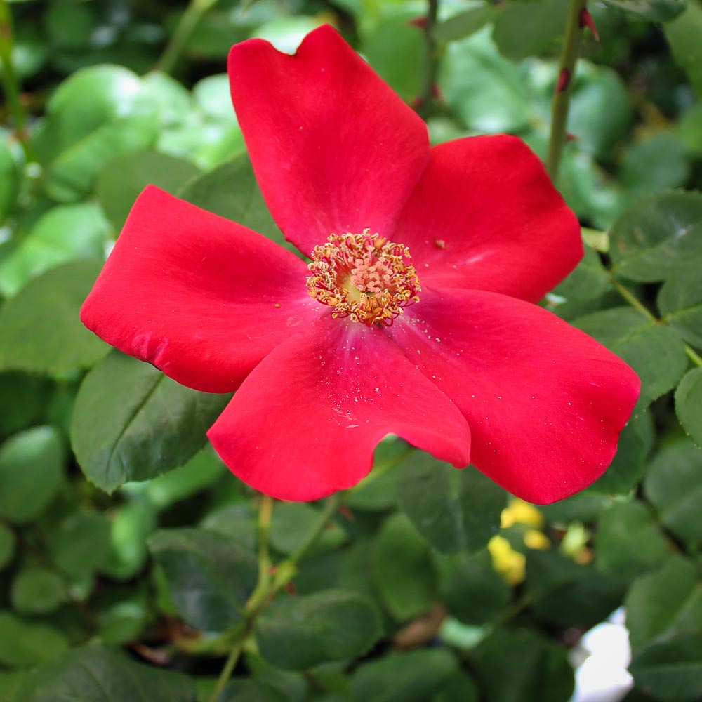 A very healthy and vigorous climber. I bought 2 Altissimo plants 20-something years ago, and they’re big and healthy. The flowers are such a brilliant red, and the bees love the open blooms. It has huge hips in the fall, too. It’s got fairly rigid canes for a climber, and definitely fares better on a trellis than an obelisk. It can also be grown as a very tall shrub.