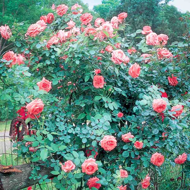 Fittingly, America is an American Rose Society – All American Rose Selection and has been pleasing gardeners since 1976. America is a continuously blooming and intensely fragrant climbing rose with pointed buds that open into very double salmon-pink blooms. Can reach heights of 8′ to 12′ tall. Bred from ‘Fragrant Cloud’.