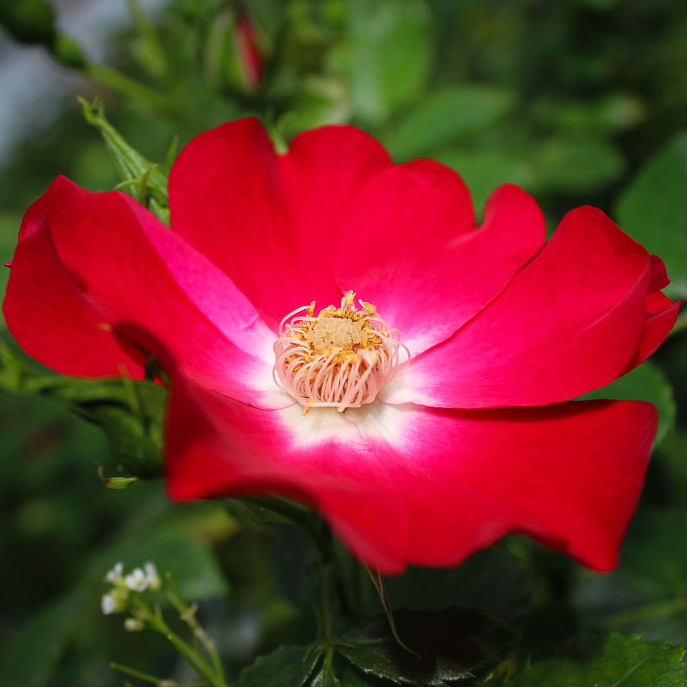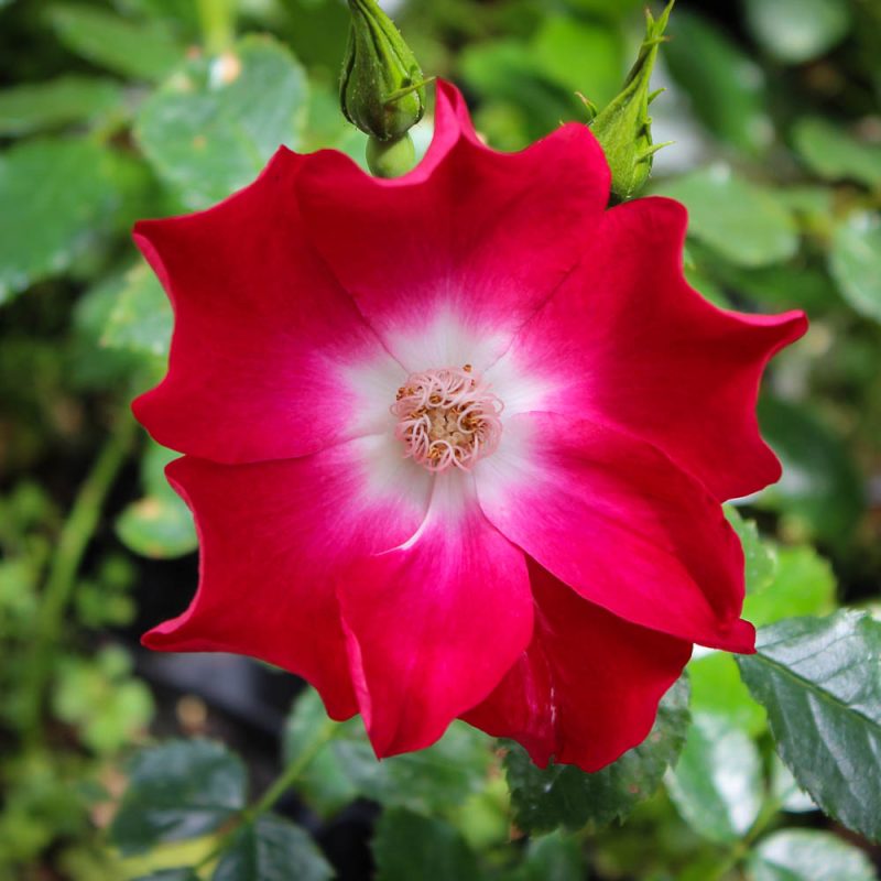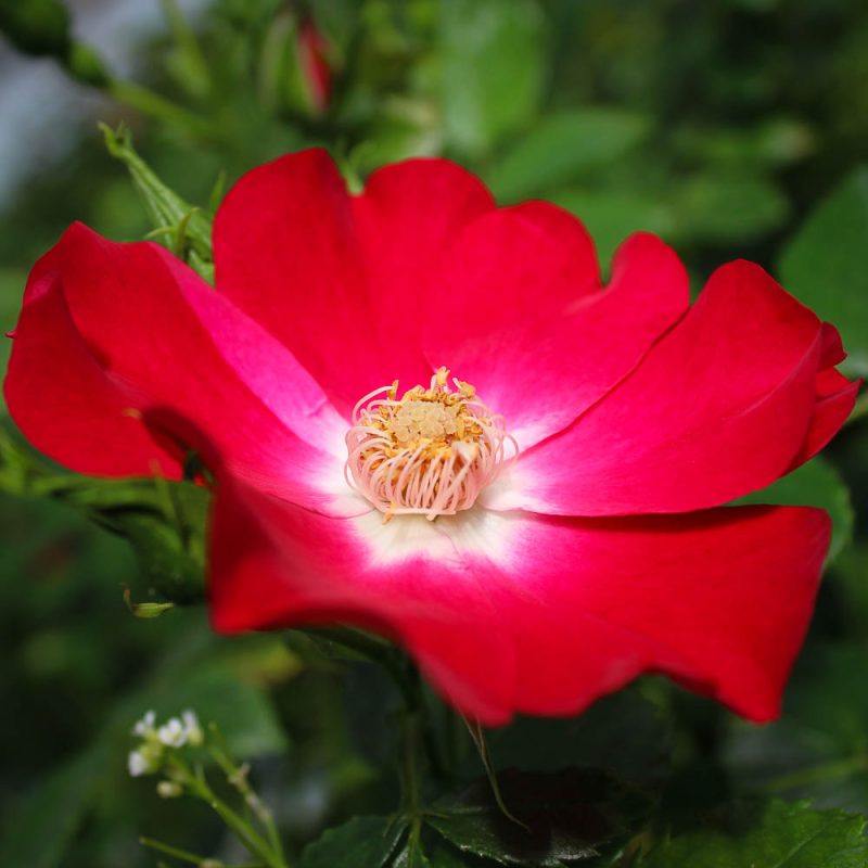 This iconic climbing rose features striking cherry red flowers with contrasting white centers. Blooms cover this climber all summer and are accented by glossy, dark green, and holly-like foliage on canes reaching 10 feet in length. Sets attractive orange hips in the fall. Loves full sun.