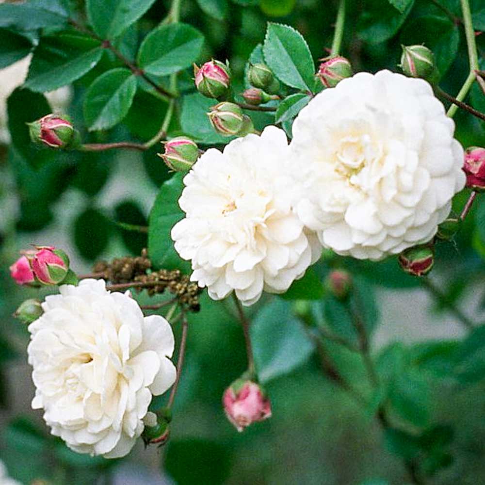 Fragrant white, perfect rosette-like double blooms in large clusters completely cover this vigorous rambler in mid summer. Very disease resistant, glossy foliage with bushy growth to 12 feet.