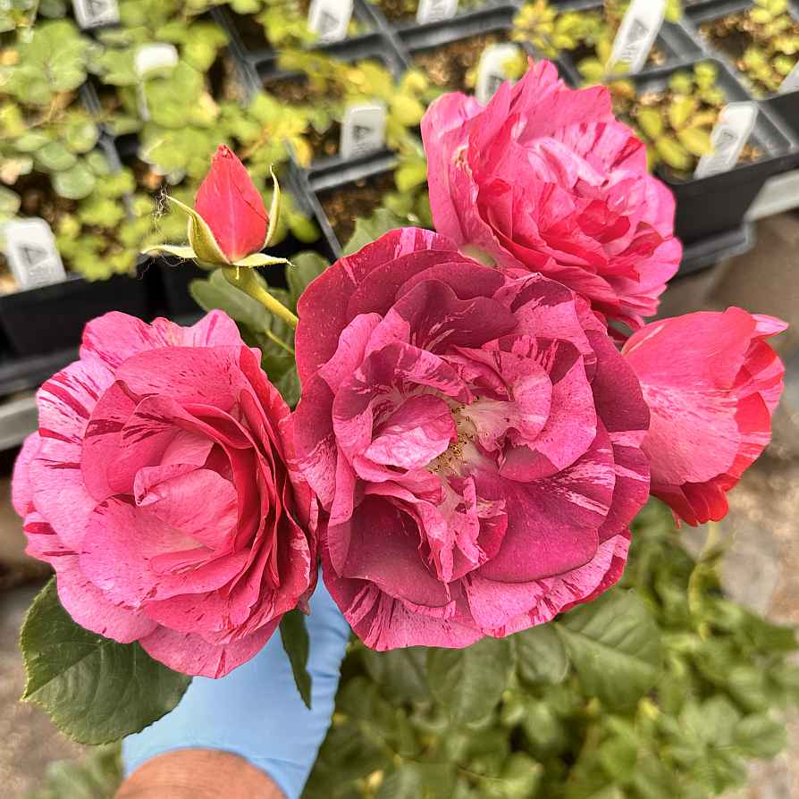 New to my garden – Spring 2025. Bought this grafted rose at a nursery late in the season. Full of blooms, pretty multi stripped white/pink/purple. Being a new introduction, not a lot of information or reviews out there. It now resides in a large pot. The growth is one of a climber, has long canes and the need support or real estate to spread. Healthy and unique rose. No scent. Zone 9B central California.