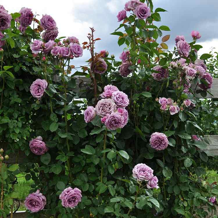 Very double, lavender flowers on a robust and disease resistant, climbing rose. A compact rose with repeat blooming throughout the season. Cupped blooms offer a moderate sweet rose fragrance that will perfume the breeze. Blooms can be cut for use in vases. Foliage is dark green and leathery. A lavender climber no garden should be without!