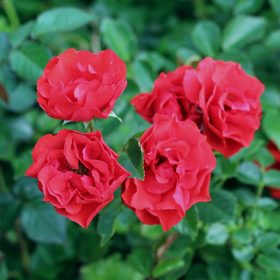 Clusters of bright, geranium red flowers cover this classic rambling rose that can reach heights of 10 to 12 feet. An ideal choice for coverage along a fence, or it can be easily trained to climb. A solid repeat bloomer with a light scent. Bold, bright green and glossy foliage.