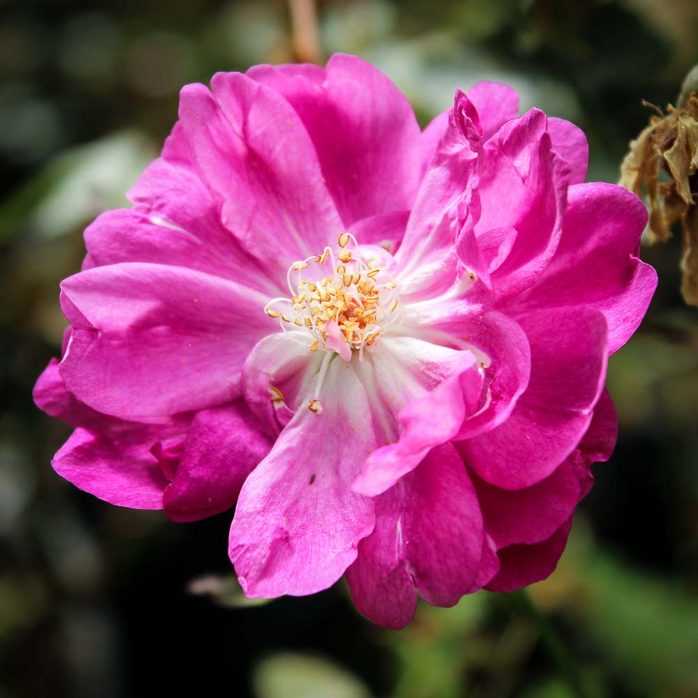 Clusters of small, apple scented semi-double flowers begin a deep violet shade and age to mauve. Nearly thorn-less canes with glossy, disease resistant green foliage grow to 12 feet in warm climates or as a large, mounding shrub in cold areas. Beautiful reddish-purple fall foliage.