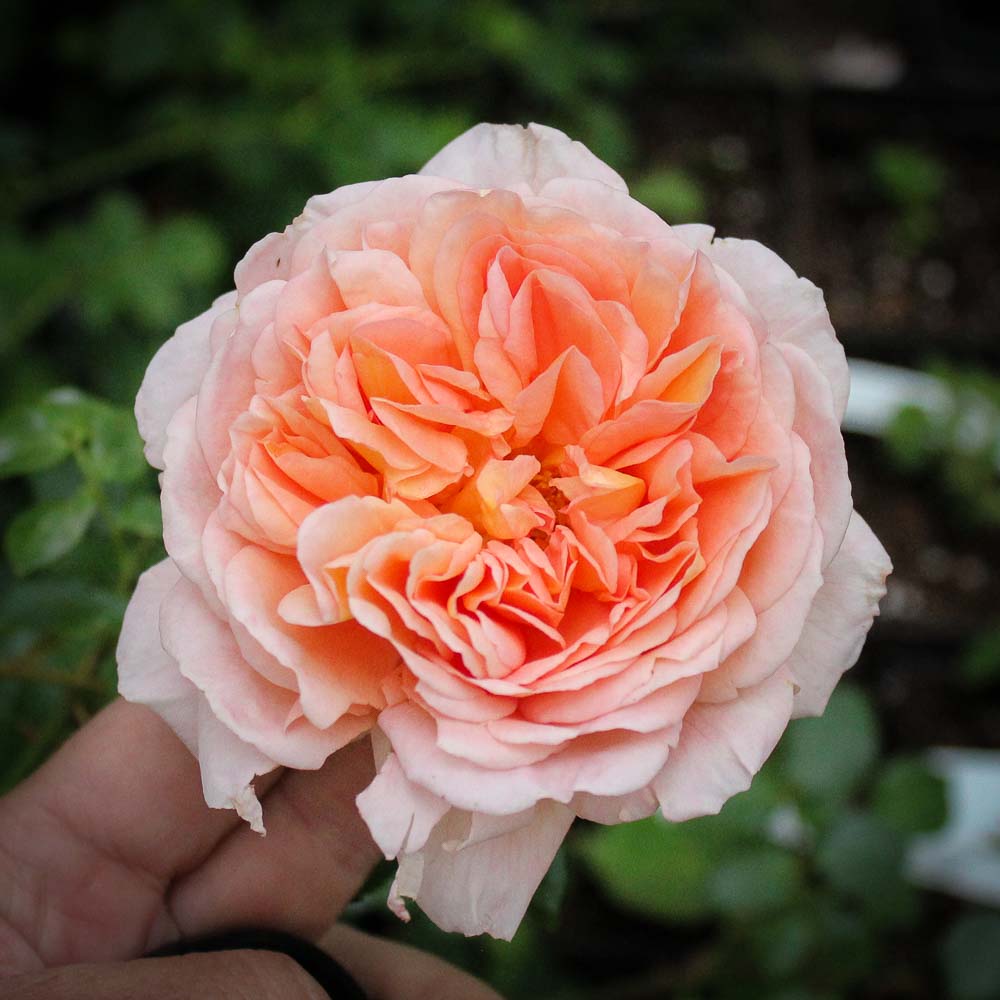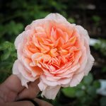My absolute favorite rose, and I’ve grown many. Abe has strong growth, nice bush structure and desire to bloom. The fragrance is rich, strong, and fruity, almost tropical fruit. In my garden the flowers are rich apricot in the center, fading to a very pale pink in the outer petals, and they retain a cup shaped form which I love. In my garden/climate in the high desert, he is a bit quirky to grow. He didn’t want to grow much until I gave him chicken based fertilizer and plenty of water. The flowers are lovely when cut and a few blooms will fill a room with fragrance.