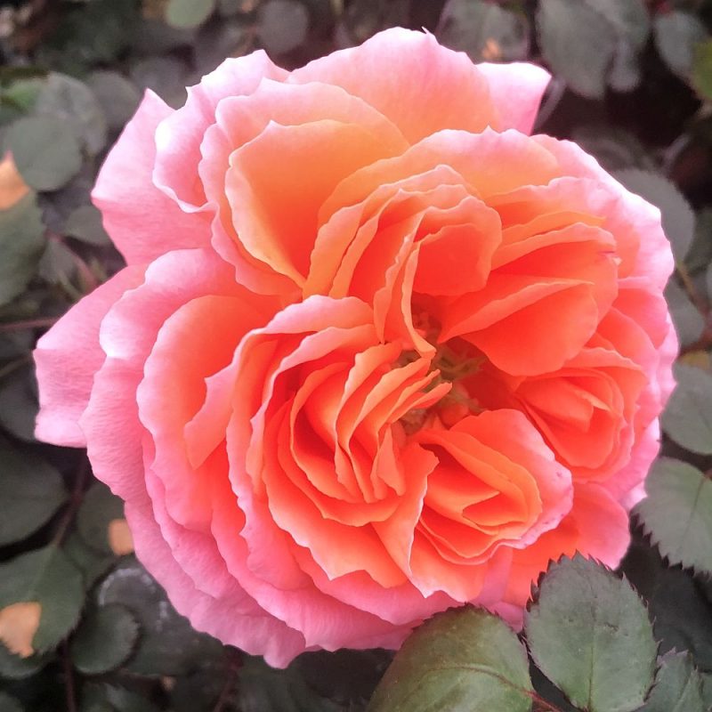 This is a really incredible rose. It is one of the more unique roses in my rose garden. This rose has a habit of producing “roses blooming within the roses”, rose proliferation, with first showing green centers that develop little rose buds. Reminds me of those Italian ranunculus flowers with a green center. Color is a pretty salmon orange and has grown well in a container.