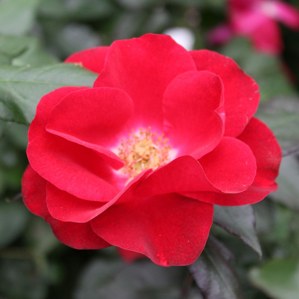 Deep, satiny red blooms in large clusters repeat freely from summer through fall. New foliage is mahogany red, turning glossy green as it matures. Reaching only 2–3 feet in height and width, this spreading shrub makes a fine low hedge or border.
