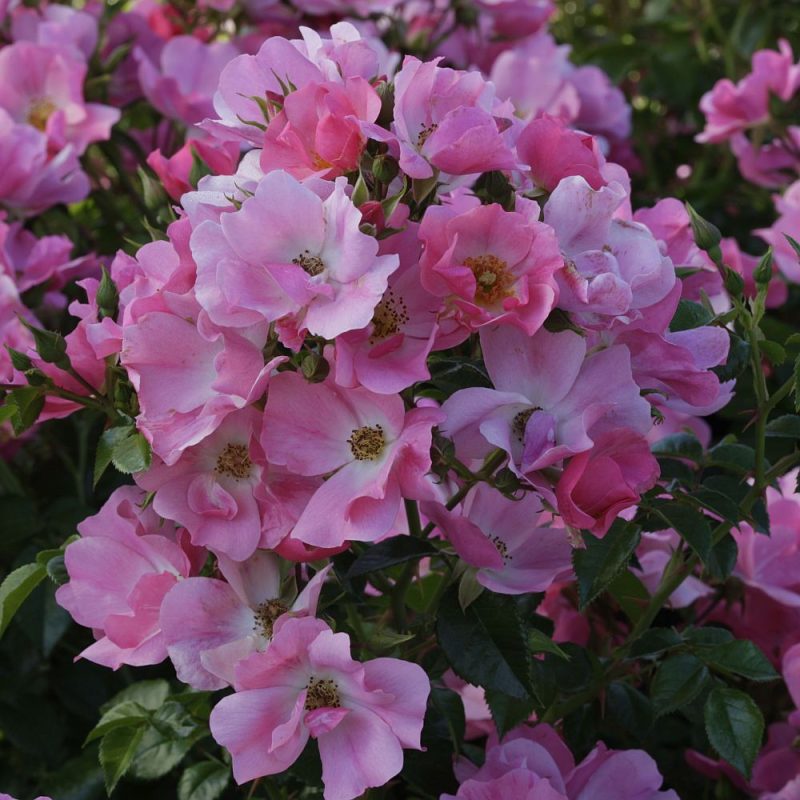 Get ready for flurries of pink flowers. This gorgeous garden addition features a 3 foot mounding habit with lush disease resistant foliage. Flowers are delicately ruffled, single medium pink blooms in huge clusters. A light tea scent accents the clusters and makes it wonderfully inviting for pollinators. Ideal for mass plantings and borders.