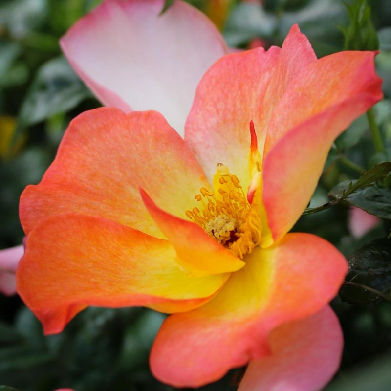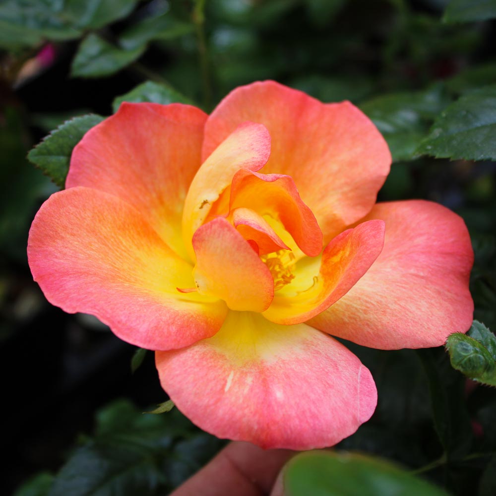 Few roses can steal a lonely heart like this Scottish import. Raucous colors of orange and scarlet with a yellow ‘eye’ come in bountiful clusters on the easy-to-grow bush. The foliage is so glossy green that you have to feel it to believe it. Sweet apple fragrance. A consistent performer with increased size in cool conditions.