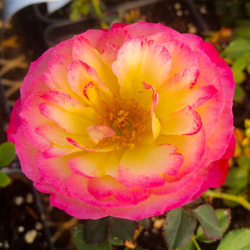 This was a gift from my daughter. What a beautiful little rose. First it didn’t grow and then it really took off. Lots of blooms. I will train it up a peony ring next year that the flowers can be appreciated. Right now its crawling on the ground. Even friends commented how colorful the blooms are.