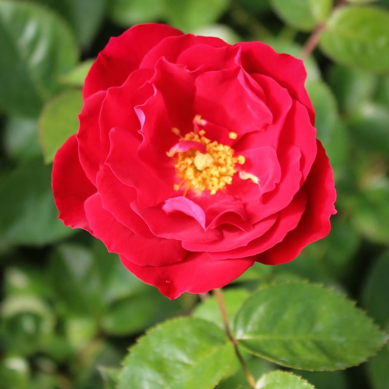 When it comes to bright glowing red ground cover roses, this one’s hard to beat. Nicely-sized showy flowers come in large clusters to drape over a wall or spill from a standard. Better yet, that killer color holds to the very end. Clean doubly-dark glossy green leaves round out the display on this super vigorous gem. Very consistent in all climates.