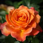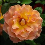Rosie the Riveter pays tribute to the women who worked in factories and shipyards during World War II. Exquisite pointed buds open to reveal old-fashioned orange-gold flowers suffused with a tinge of pink. A moderate spicy fragrance and very glossy foliage add to the charm and strength that exude from this garden workhorse.
