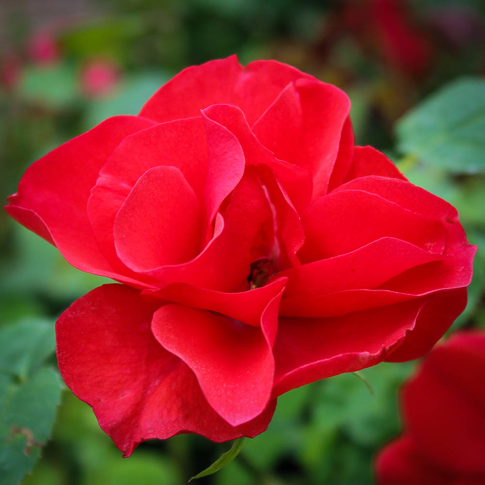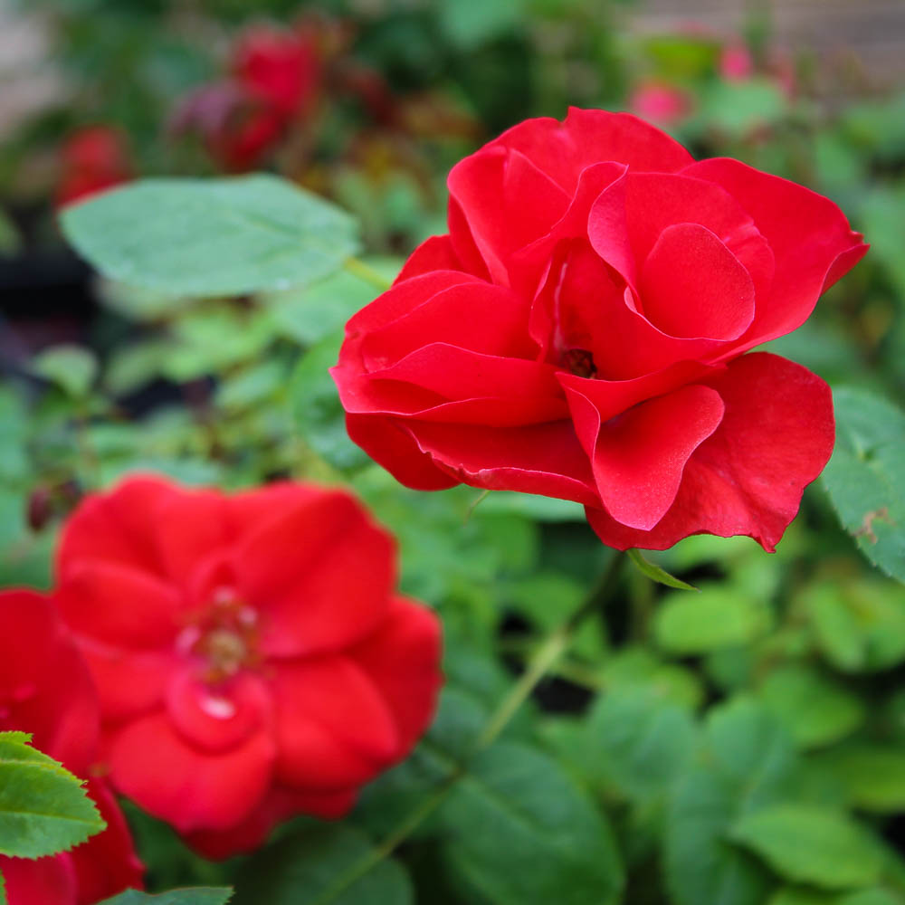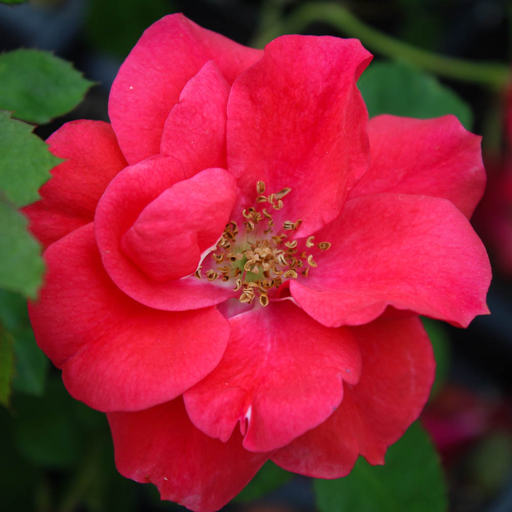 This profusely blooming rose has trusses of fiery red, double blooms on an upright, bushy, disease resistant shrub. The mildly fragrant blooms give way to bold hips in the fall. A great rose in the landscape. The compact size makes a great hedge.