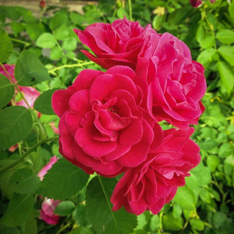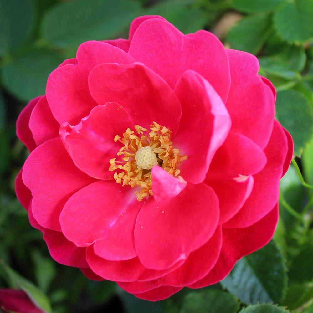 Clusters of cherry red, double flowers cover this bush in spring with a later repeat. Forms a hardy, disease resistant shrub growing 3-4 feet tall and wide.