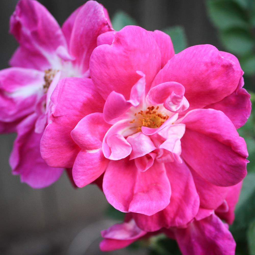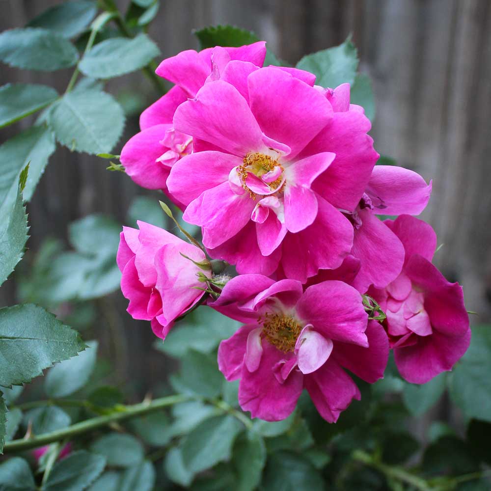A hardy climbing rose that flowers heavily in early summer and repeats bloom several times through fall. Blooms are deep pink, semi-double, lightly fragrant and are borne in clusters of up to 30 flowers. Shade tolerant and very disease resistant. Strong, arching canes reach 7 to 10 feet tall and wide, even in cold climates!
