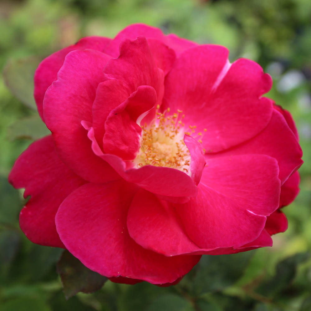 A real show-stopper with semi-double blooms of vibrant deep pink that repeat well from summer until late fall. Young foliage is maroon, turning dark green as it matures on an exceptionally hardy shrub.
