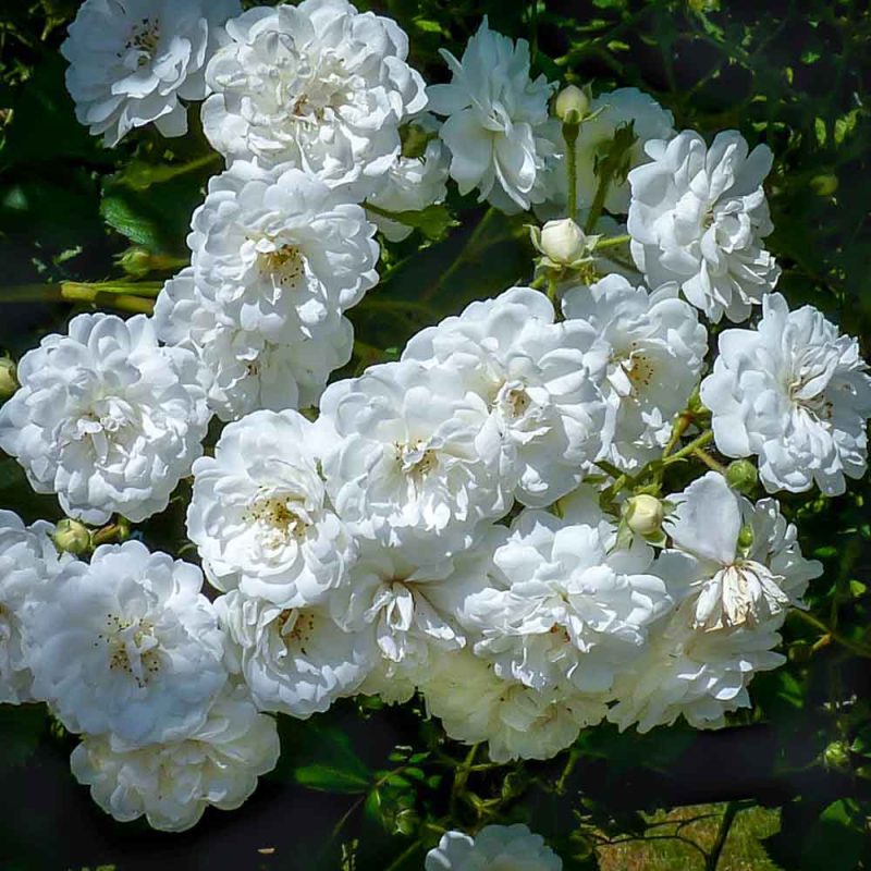 The “Garland of Love”, is a stunning, climbing Hybrid Musk Rose that is covered in clusters of small white flowers throughout the growing season. It is perfect for growing over trellis, archways or pergolas to add some color and soften hard lines and unlike normal climbing roses, will tend to “bush out” at the same time so that the effect could be described as a cloud of white when in full bloom.