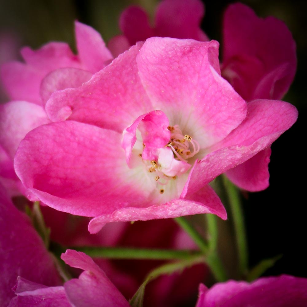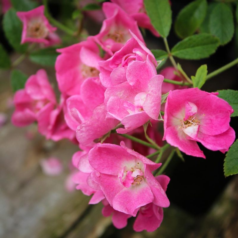 Fragrant clusters of semi-double cherry red blooms all season, followed by tiny red fruit in fall. The bush is dense and compact, reaching a height of 3 to 5 feet in cold regions, though warmer areas it can grow to a much larger size.