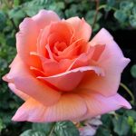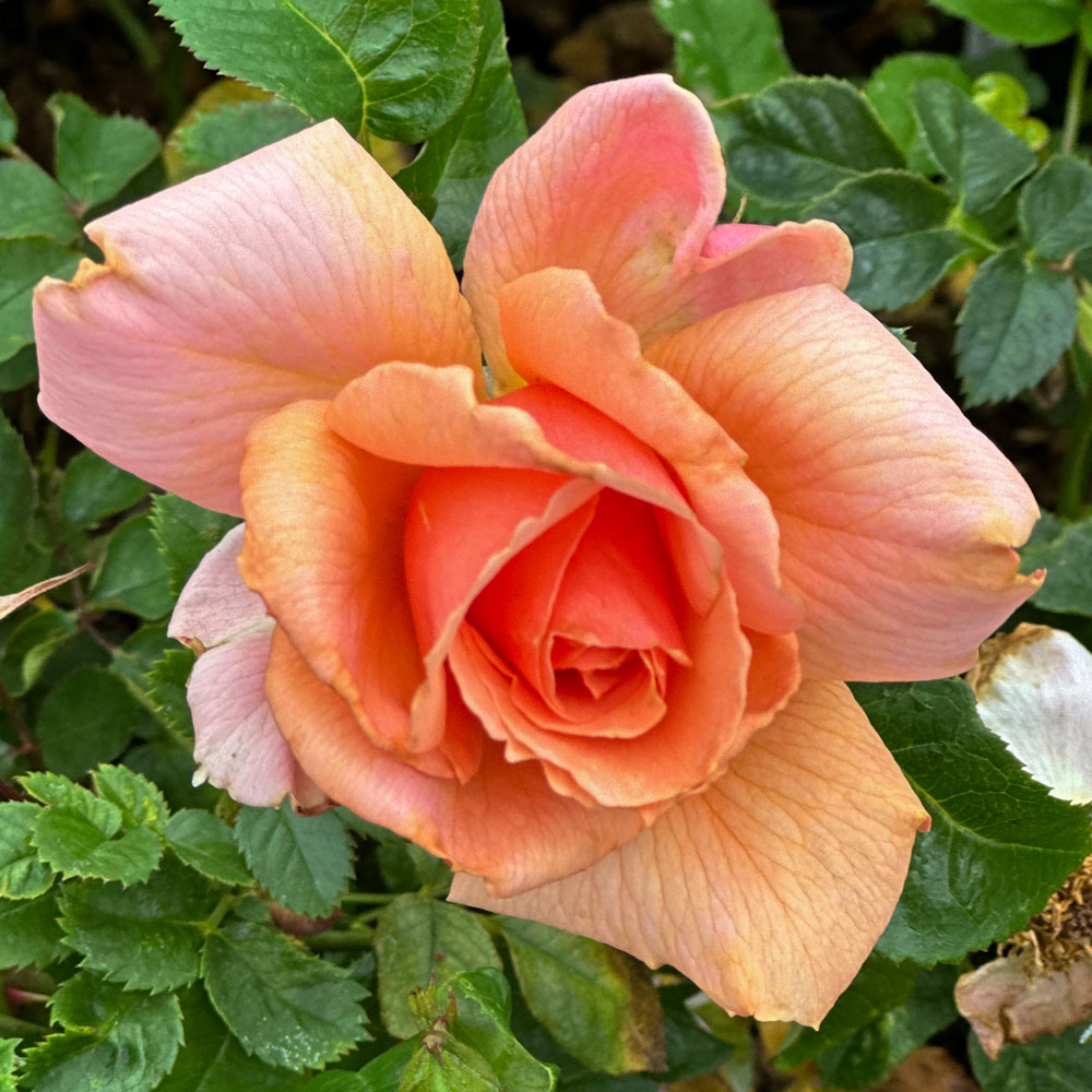 This lovely hybrid tea rose is a true treat for the senses. Intricate ruffled edged petals in shades of apricot and coral contrast nicely with the soft green foliage. Fragrance is surprisingly spicy and this rose loves the sun. A good performer on both coasts above average resistance to diseases.