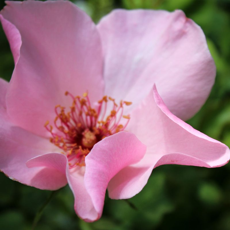 An exceptionally tough, hardy hybrid tea. Five ruffled, rose pink petals surround maroon stamens in showy clusters of blooms. Fragrant, freely flowering throughout summer and fall. Dark green leathery foliage on a bush 3–4 feet tall and wide.