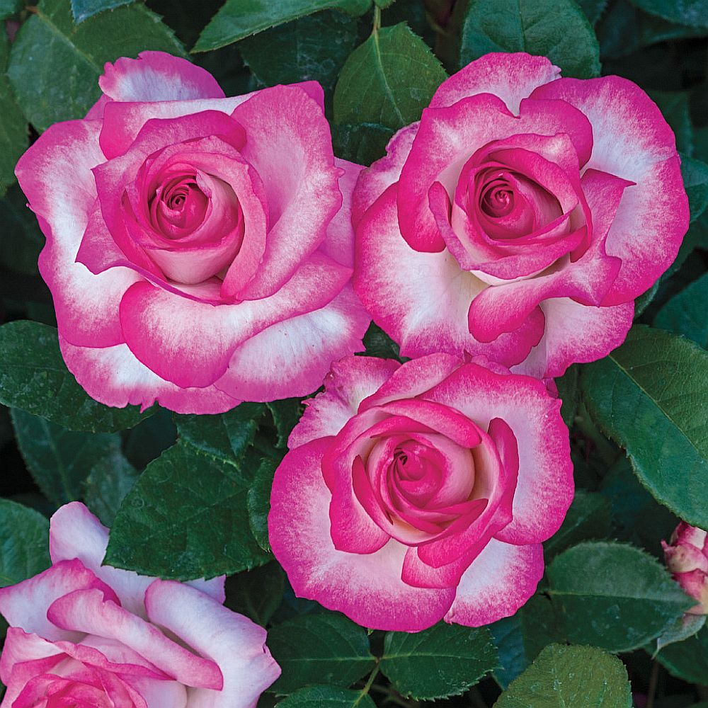 This rose’s pleasant personality will be the center of attention in any garden. The base color of this rose is white with vibrant blended pink edges. Long, sturdy stems make this a favorite for cut-flower arrangements. The rose’s poise and grace shine through with large healthy glossy dark green foliage and a strong disease resistance.
