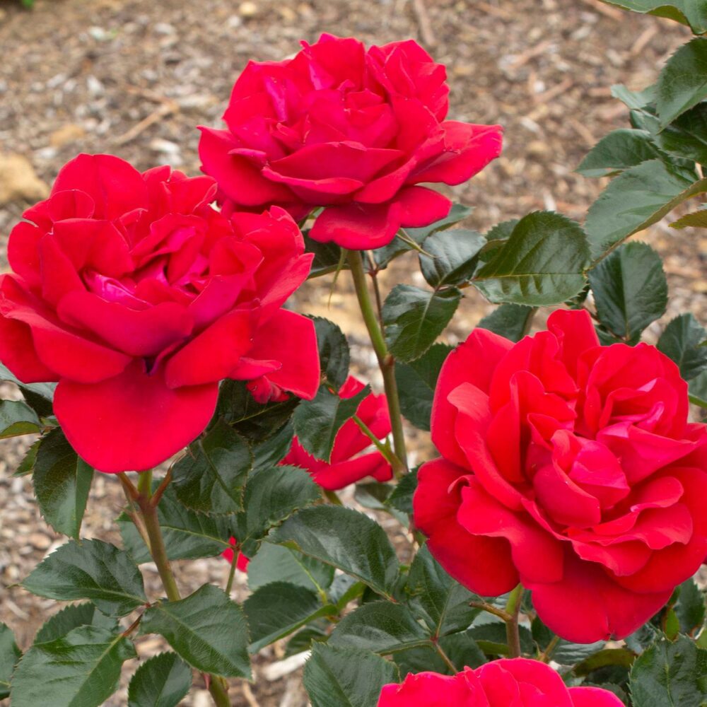 Ruby Red has a deep dark red color that pops against its dark green foliage.  It can be planted as a container rose or out in the garden as a great pop of color.