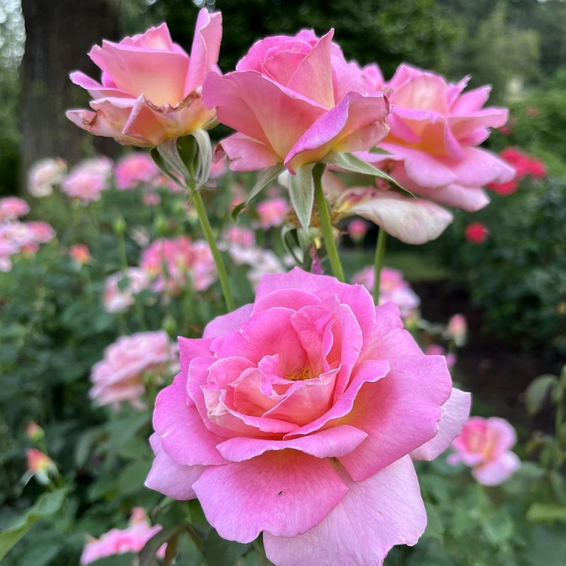 A stunning rose with giant blousy pink blooms with touches of yellow! Love her!