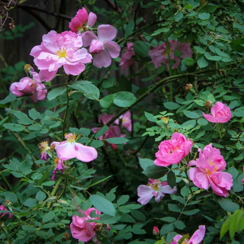 Long pointed buds open to large, very fragrant semi-double, recurrent pink blooms. Growth is upright, then gracefully arching, featuring apple scented foliage and some shade tolerance. Height and spread to 8 feet. One of my favorite roses.