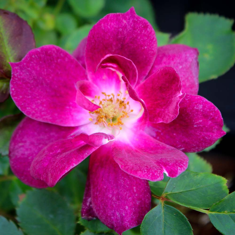 A rose with an unusual color, rich purple fading to deep red, reflects back to the old Gallica roses. The blooms are fragrant, double and repeat well. The bush grows to 3 or 4 feet high and just as wide with medium green foliage.