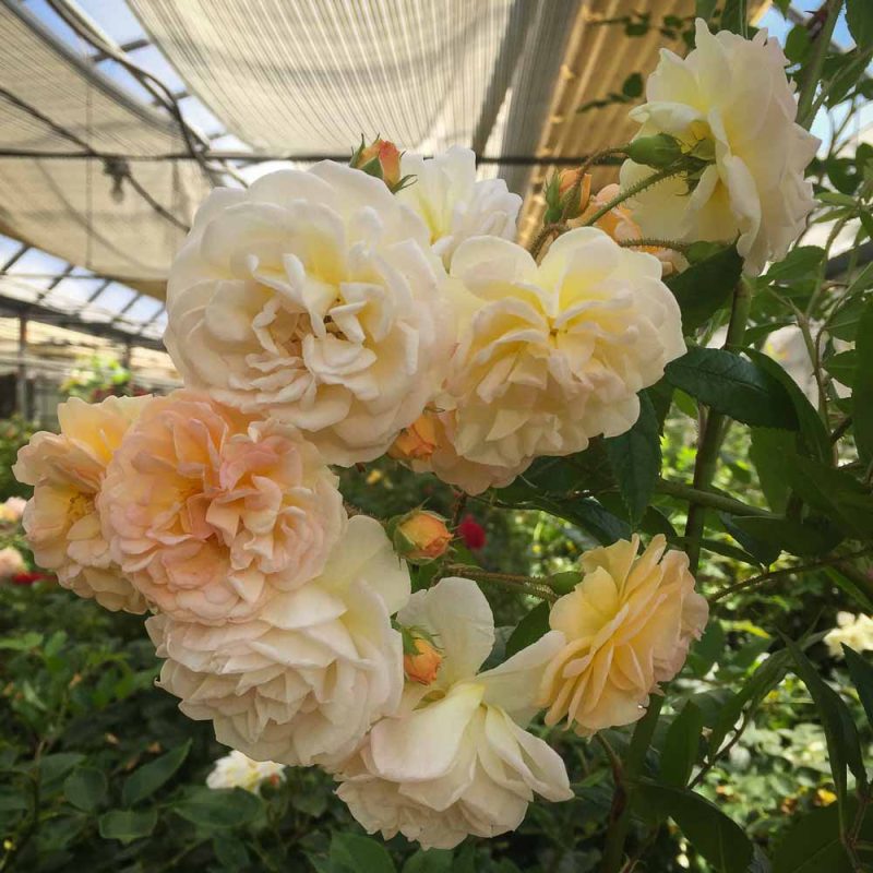 This old-fashioned rambler forms a large shrub with few thorns. Fragrant bloom clusters open apricot, aging to pale yellow. Occasional repeat bloom. Canes can reach 6 to 10 feet. Our stock was obtained from Denver’s historic Fairmount Cemetery.