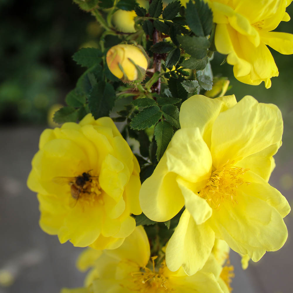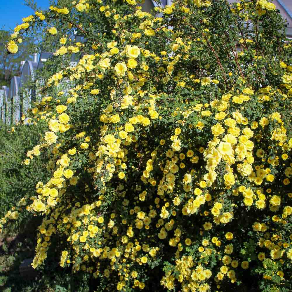 These roses grew feral where I had previously lived in Idaho, and I grew to love them, so when we first bought our house in Montana in 2019, I ordered two plants from High Country Roses to plant right in front of my kitchen windows. I warned my husband that I wanted them to have a feral look and that they would form an enormous brier clump, but that this was what I wanted. And boy have they! They are very tall now, and each June, right around my birthday, produce enormous sprays of bright yellow blooms. Oh my! They are now big enough and prodigious enough that with my windows open, I can smell the roses inside my kitchen and hear the buzzing of the many, many bees who visit them. They need little care here in Montana and yet bring me so much joy. One of the best things we’ve done for our house and grounds. Thanks for carrying this one, High Country!