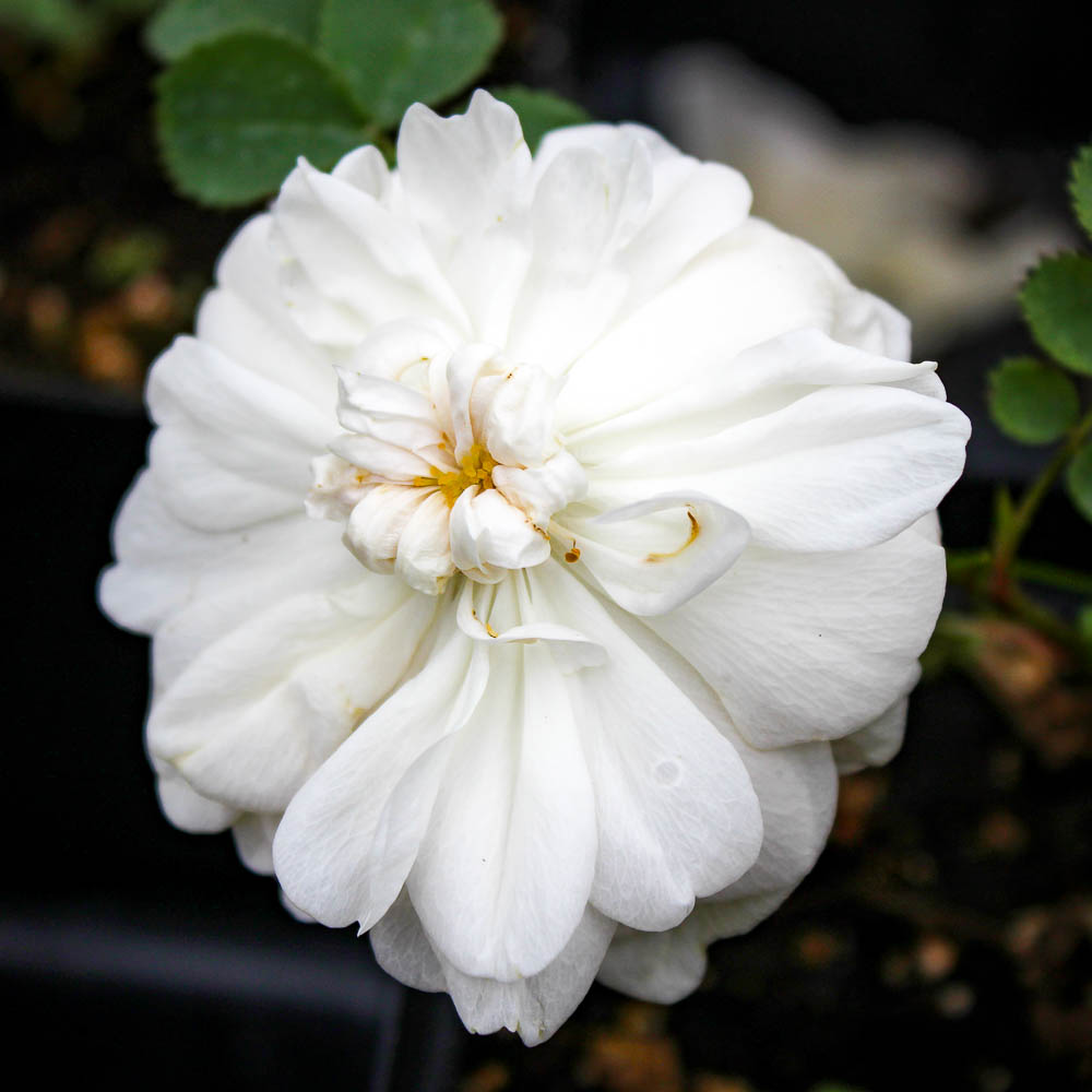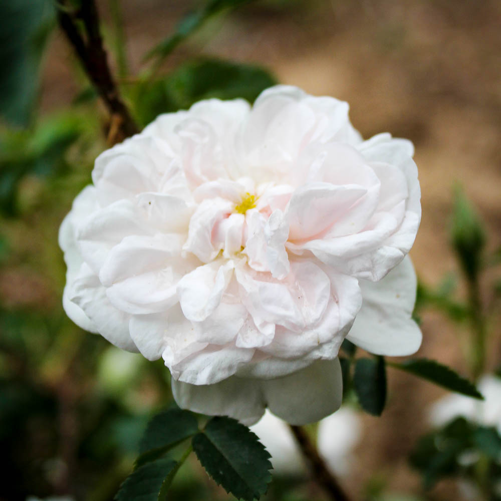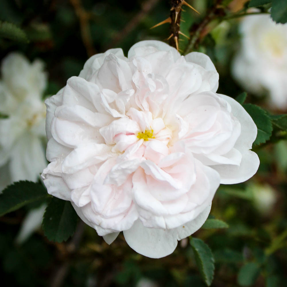 An old-fashioned favorite with double, white with a hint of pale pink, and quartered flowers that repeat through the season. The shrub is gracefully arching, with spreading canes to form a densely mounded shrub to 5 feet tall.