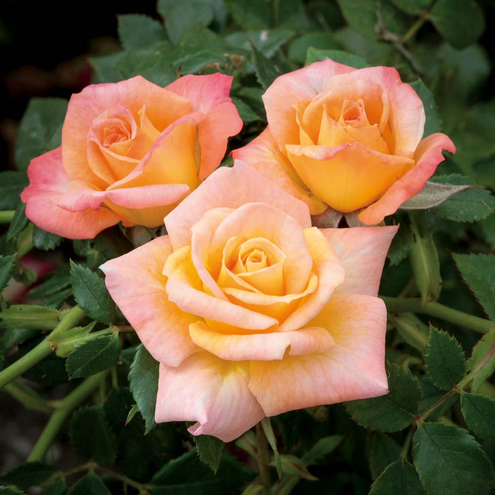 Exquisite, high-centered buds are yellow with a light overlay of pink that is delicately blended to create that delightful long-lasting peachy color. The edge of each petal is kissed with a pleasing pink blush. Ideal for small spots in the landscape or even to grow in a pot on the balcony. A perfectly balanced, rounded and compact plant produces an abundance of blooms on stems that are well adorned with proportional foliage.