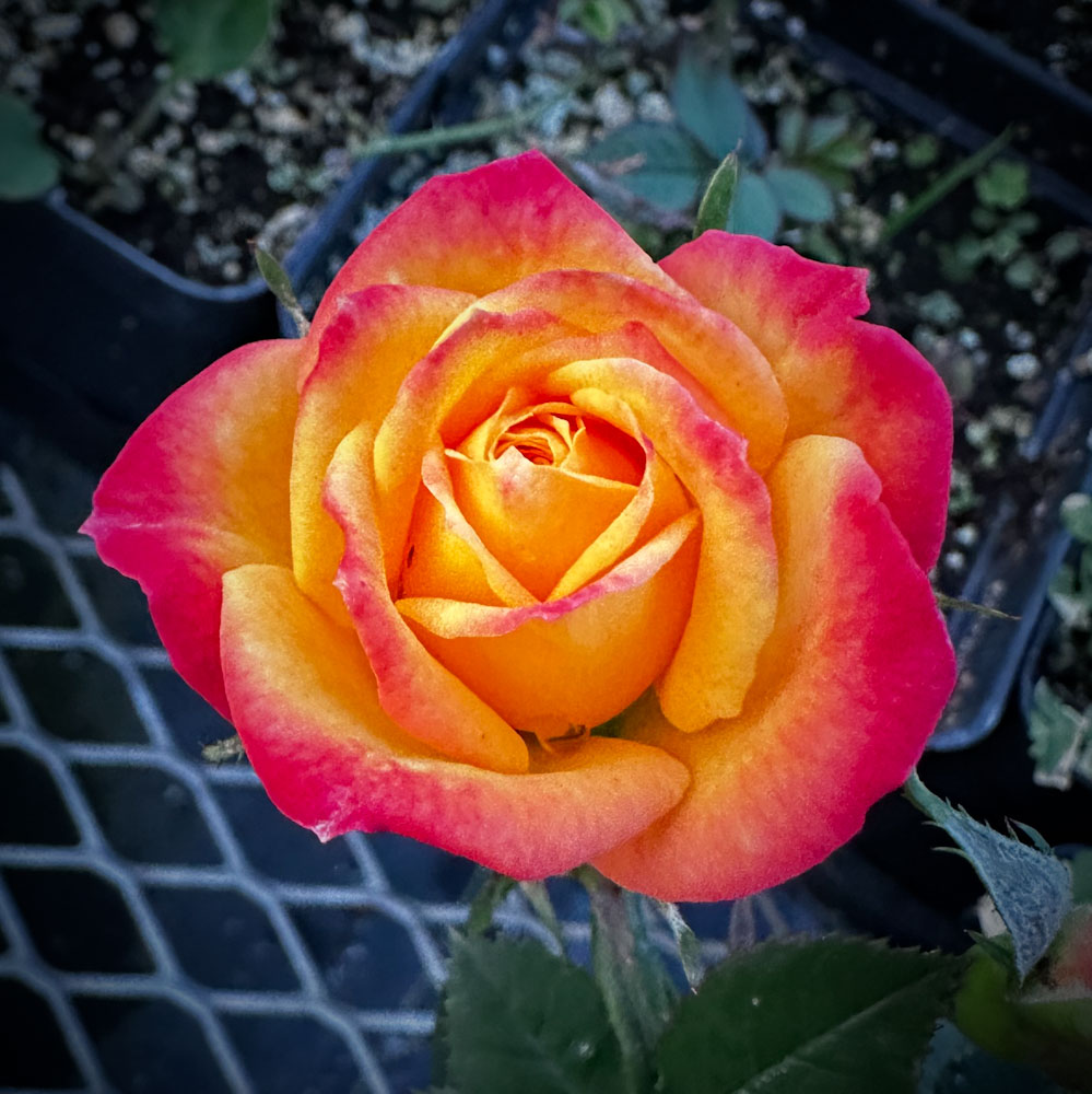 If you like Rio Samba, you will love this rose. It’s like a mini version of that rose. It blooms a lot and the blooms are very colorful, and you end up having all the colors between red and yellow on the shrub at once. It’s a very nice mini rose! I have mine planted between the orange mini All A-Twitter and the yellow mini Lemon Drop, and they look really nice together.