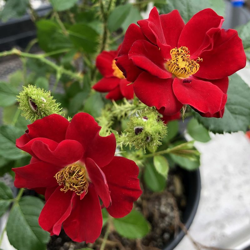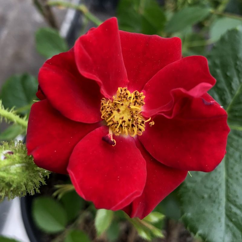 I was so happy to find this exquisite moss rose here, one of my top favorites. I could say I love it as much for the deep emerald green stems, thorns and mossy sepals as the scarlet flower with the large showy mass of golden stamens in the center. The vibrant green and red are perfect compliments to this compact plant. I love opposites, the English roses with 100‘s of petals and then this rose along with the 1925 single, Dainty Bess and the China Rose single, Mutables. Bought all 3 at High Country Roses. Matt, by the way couldn’t be nicer or more helpful man. My roses also arrived overnight, which was a big plus in our 100+ temps. A mega thumbs up!👍 John Beaty