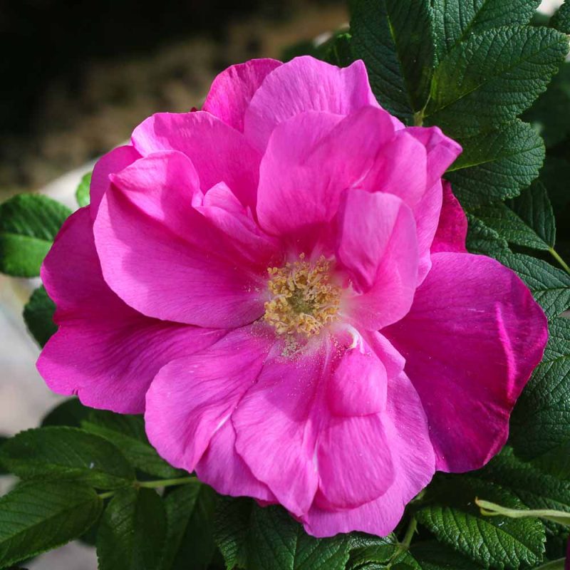 Somewhat unique for a hybrid rugosa, Dart’s Dash forms a smaller, bushy shrub 2 to 4 feet tall and wide. The plant itself features rich, dense, and heavily wrinkled foliage. Blooms are very fragrant, large, semi-double purple-red blooms with excellent repeat. To top it all off, Dart’s Dash sets large colorful hips in the fall.