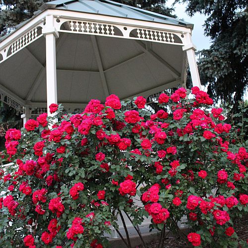This rose doesn’t just bloom, it blooms in bouquets.  Massive clusters of rich red flowers cover Linda Campbell from spring until frost. Healthy, rugose foliage covers the shrub reaching 4 – 6′ tall and wide (or more in warmer zones!). Named for our late, great friend of the rose from Denver who was a leader in the American Rose Society.