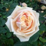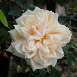 I discovered this rose climbing a large trellis on the terraces at Powis Castle in Wales in 2000, and spent a few years searching for it in the U.S. It now climbs over the door of my studio in Southern California, where it is clearly not as happy as in the damper, cooler Welsh environment. Nevertheless it is not fussy, it has beautiful apricot blooms, is a good climber and has a lovely scent. Mine – and the one at Powis Castle – is definitely not yellow, really more apricot/blush.