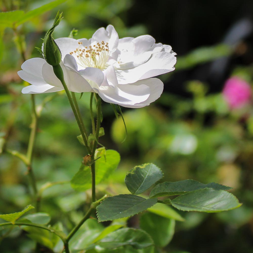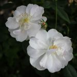 My Nastarana is just a few months old, living happily in a pot on the north side of my house where it gets morning/evening sun and afternoon shade. It has already put out several flowers. They last for a couple of days. They are blushed pink in the bud and white when the flower opens. The scent is only perceptible when you put your nose right on the flower, although it’s possible that when Nastarana becomes a big bush it may give off more scent. I would describe it as like a floral perfume (not spicy, not fruity, not heavy rose like damask but still easily identifiable as rose). The petals reveal the centers of the flower, which should be good for pollinators. The foliage is delicate, you could almost say wispy.