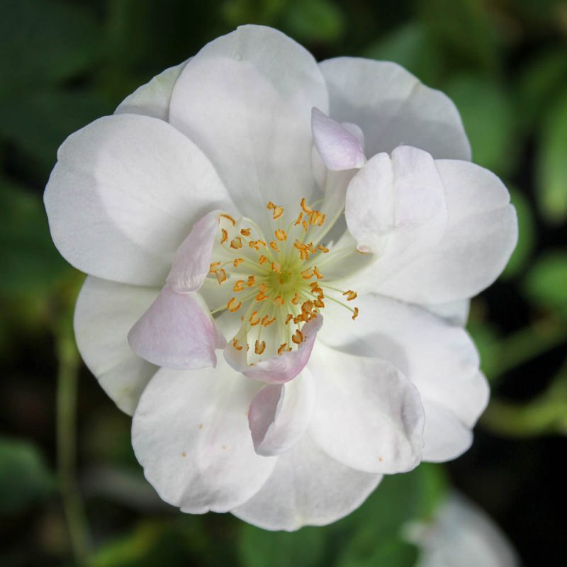 Blooms are single to semi-double, white blushed with pink. They occur in large, highly fragrant clusters in mid- season, with good repeat. Smooth, slender canes and upright growth to 4 feet in cold climates and 6– 8 feet in warmer areas.