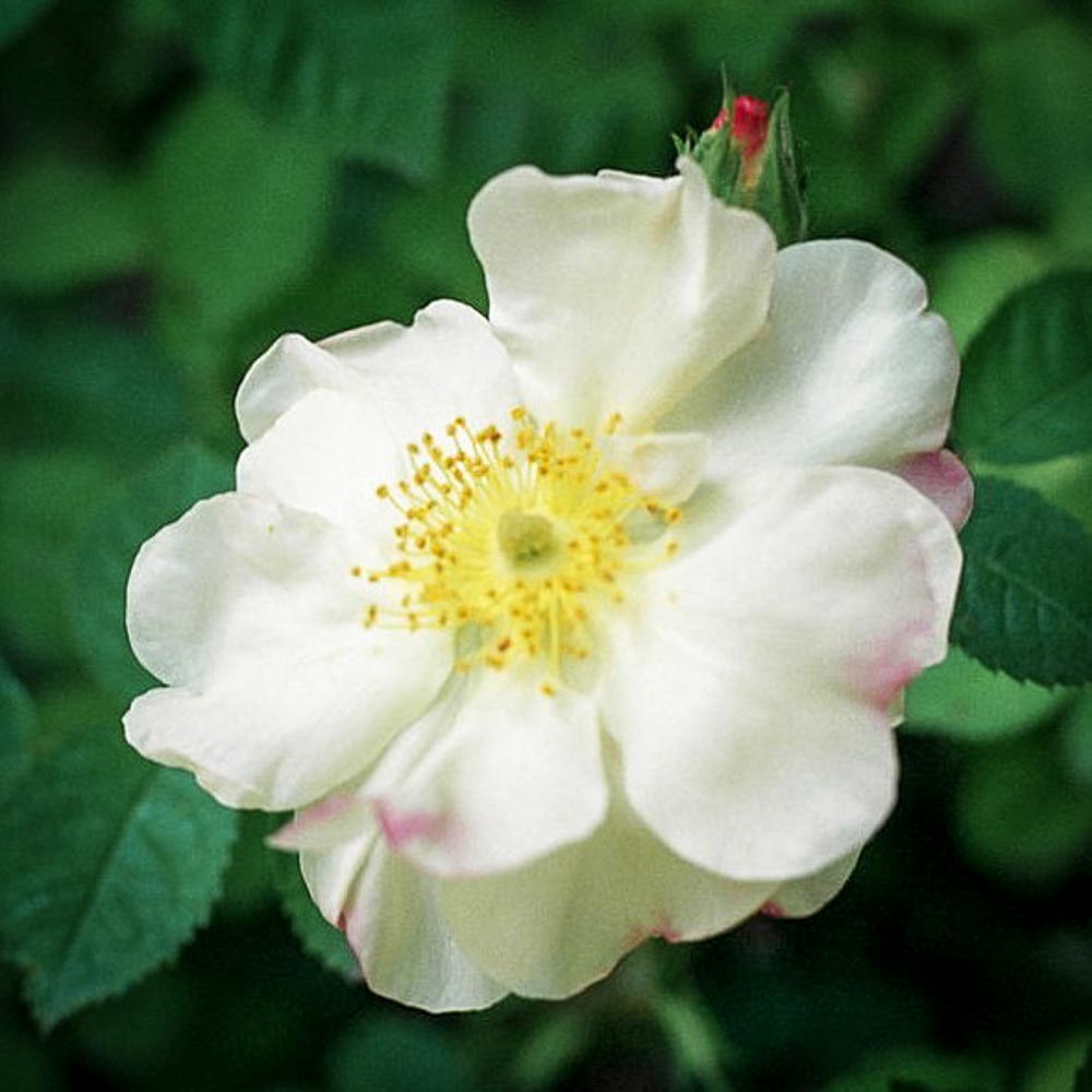 A lovely, unusual Old Garden Rose, probably cross between a Damask rose and rosa eglanteria. Clusters of semi-double cream-colored blooms are edged in pink and have a rich, musky fragrance. Blooms in early summer on a shrub reaching 5 to 6 feet in height. Attractive red hips in fall.