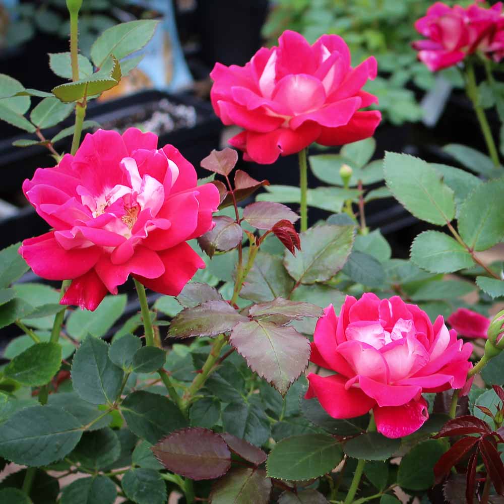 Take It Easy, relax and enjoy life! You won’t have much work to do in the garden after planting this rose for which natural disease resistance is a true statement. The dark green, shiny, & healthy foliage is the perfect background to showcase the many clustering buds and flowers. Of a classic red color, this dynamite of a rose has ideal pointy and very elegant buds. The red coloration doesn’t go too pink or blue as the petals are falling away. A touch of lighter pink reverse light up the show of this blooming machine.