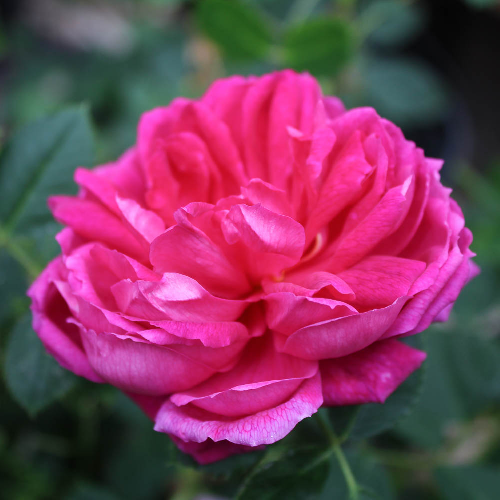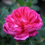 Another lovely rose found at the Fairmount Cemetery in Denver, probably a Bourbon rose. Fragrant, double, deep fuchsia-magenta cup shaped blooms with a knob of center petals. Repeats bloom if dead-headed. Dark green foliage on a shrub reaching 5 feet tall and 4 feet wide. Produces small, orange hips in the fall.